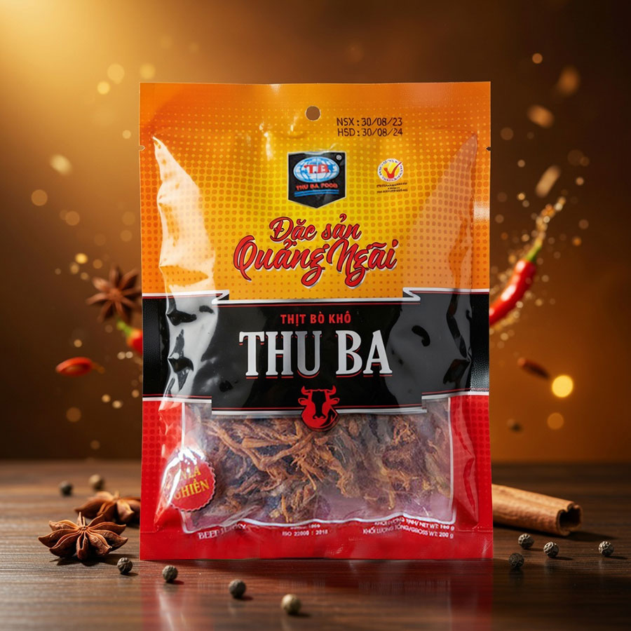 Đặc sản Bò khô Đà Nẵng thương hiệu Thu Ba được sản xuất theo tiêu chuẩn ISO 9001 – 2008 sử dụng gia vị tự nhiên như nghệ, gừng, ớt tươi, tỏi… kết hợp với bí quyết chế biến gia truyền hơn 37 năm. Sản phẩm cho ra chất lượng tuyệt vời, ngon, an toàn vệ sinh thực phẩm.